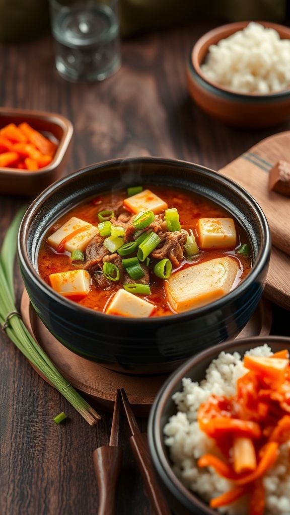 The soup features a rich broth, often made with kimchi, which gives it that signature tangy kick. Ingredients like tofu, carrots, and green onions add texture and nutrition. The combination of flavors creates a delightful experience with every spoonful.