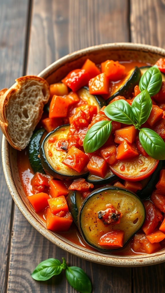 Vegetable Ratatouille can be served in various ways, making it a versatile dish. It can be enjoyed warm as a side dish or served over rice or pasta for a heartier meal. The rustic presentation in a bowl, paired with a slice of crusty bread, adds to its charm.