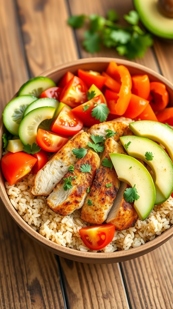 - Assemble the Bowls: In a large serving bowl or individual bowls, layer the cooked grains, sliced chicken, and fresh vegetables. Drizzle with the dressing and top with chopped cilantro.