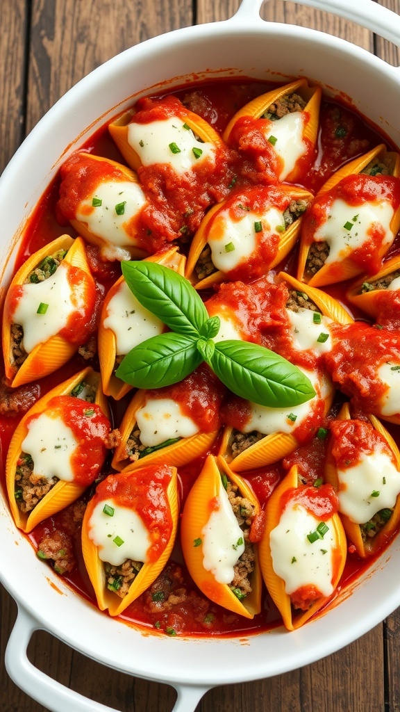 Each shell is generously topped with marinara sauce and melted mozzarella cheese, resulting in a comforting and inviting presentation. Perfect for family dinners or meal prep, this recipe can easily be adapted to include your favorite cheeses or additional vegetables, making it a versatile option for any occasion.