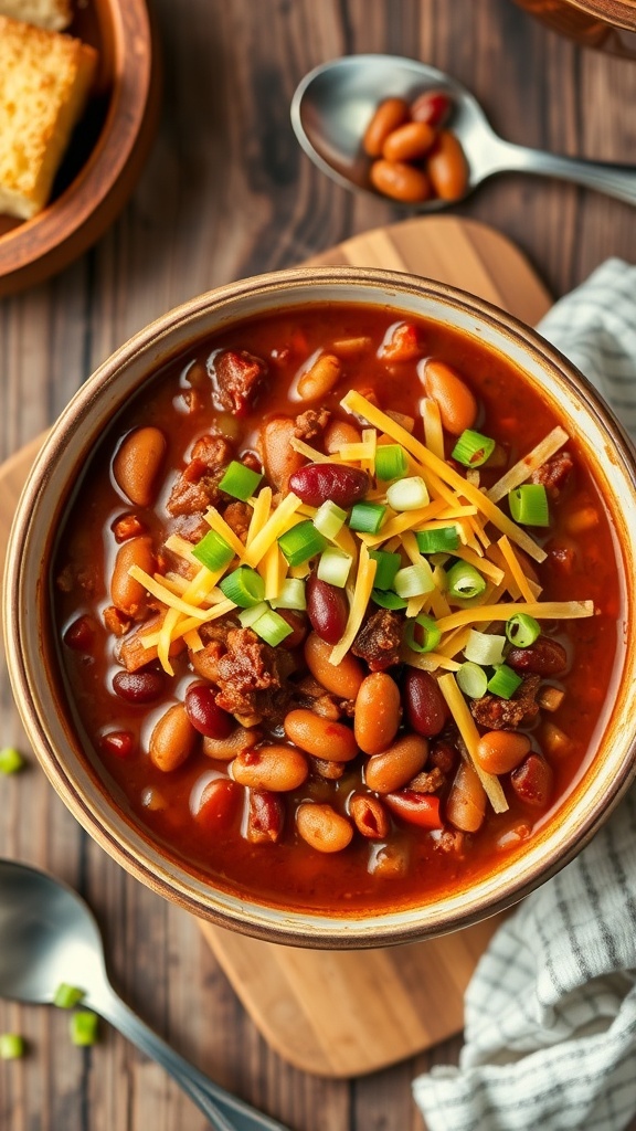 Optional toppings like shredded cheese, sour cream, and fresh green onions provide an opportunity to customize each bowl, allowing everyone to enjoy their chili just the way they like it. The addition of cornbread on the side complements the chili perfectly, creating a wholesome meal.