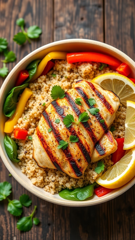 With grilled chicken slices resting on a fluffy bed of quinoa, the bowl is complemented by an array of colorful seasonal vegetables like bell peppers and spinach.